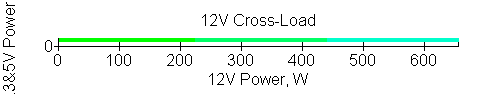 Следующим этапом инструментального тестирования является построение кросснагрузочной характеристики (КНХ) и представление ее на четвертьплоскости, ограниченной максимальной мощностью по шине 3,3&5 В с одной стороны (по оси ординат) и максимальной мощностью по шине 12 В с другой стороны — по оси абсцисс. В каждой точке измеренное значение напряжения обозначается цветовым маркером в зависимости от отклонения от номинального значения.