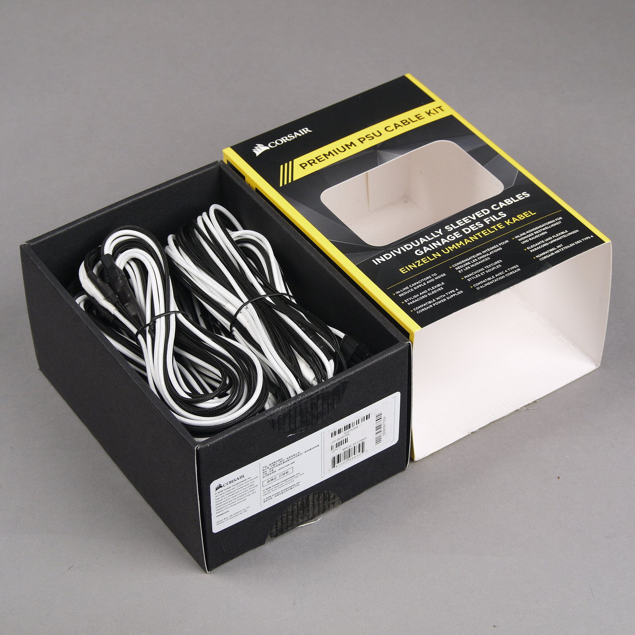 Его полное название — Premium Individually Sleeved PSU Cable Kit Pro Package, Type 4 (Generation 3), White/Black (Part Number CP-8920156). Данная модификация имеет оригинальную цветовую схему окраски проводов: провода с белой и черной изоляцией чередуются через один. В принципе, выглядит это довольно необычно, пока провода не покроются пылью и не станут одинакового серого цвета. Существуют и другие варианты расцветки, из которых можно выделить полностью красный и синий варианты.