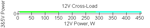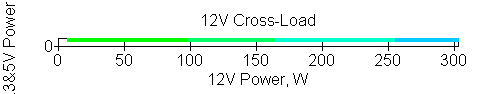 Следующим этапом инструментального тестирования является построение кросснагрузочной характеристики (КНХ) и представление ее на четвертьплоскости, ограниченной максимальной мощностью по шине 3,3&5 В с одной стороны (по оси ординат) и максимальной мощностью по шине 12 В с другой стороны — по оси абсцисс. В каждой точке измеренное значение напряжения обозначается цветовым маркером в зависимости от отклонения от номинального значения.