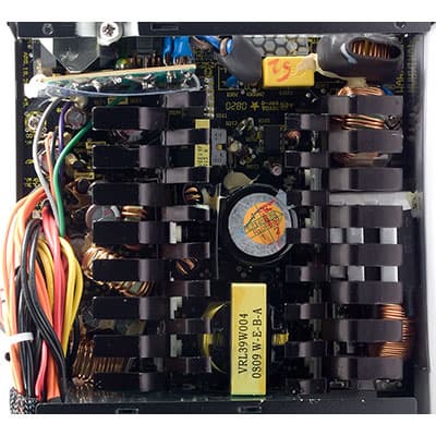 Коэффициент полезного действия, в среднем, по всему диапазону мощности составил около 80,8 процента, что является средним показателем. При этом КПД в диапазоне от 50 до 250 Вт составил около 79,7 процента, а в диапазоне от 100 до 500 Вт — 84,4 процента. Коэффициент мощности у данного блока питания составил в среднем 96,1 процента, что является очень хорошим показателем для БП, оснащенных активным корректором коэффициента мощности.