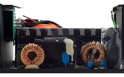 Основные полупроводниковые элементы установлены на радиаторы средних габаритов с мощным основанием толщиной 4 мм. Входная диодная сборка так же установлена на радиатор с толщиной основания около 3 мм. Радиаторы частично перекрывают, расположенные рядом с ними элементы (трансформаторы, дроссели, конденсаторы), что можно считать недостатком конструкции, однако у лепестков радиатора достаточно большой шаг и небольшая длина, поэтому элементам будет обеспечена вполне приличная вентиляция. Радиаторы имеют постоянную толщину на всем протяжении, что должно положительно сказаться на равномерности их прогрева и отводе тепла от охлаждаемых элементов в целом.