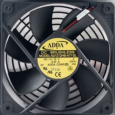 Под вентиляционным отверстием, закрытым проволочной решеткой, установлен нагнетающий вентилятор AD1212HB-A71 типоразмера 120 мм производства ADDA Corporation с максимальный током потребления 0,37 А. Вентилятор основан на гидродинамическом подшипнике и имеет максимальную скорость вращения 2200 оборотов в минуту, что должно положительно сказаться на уровне шума при работе блока питания.