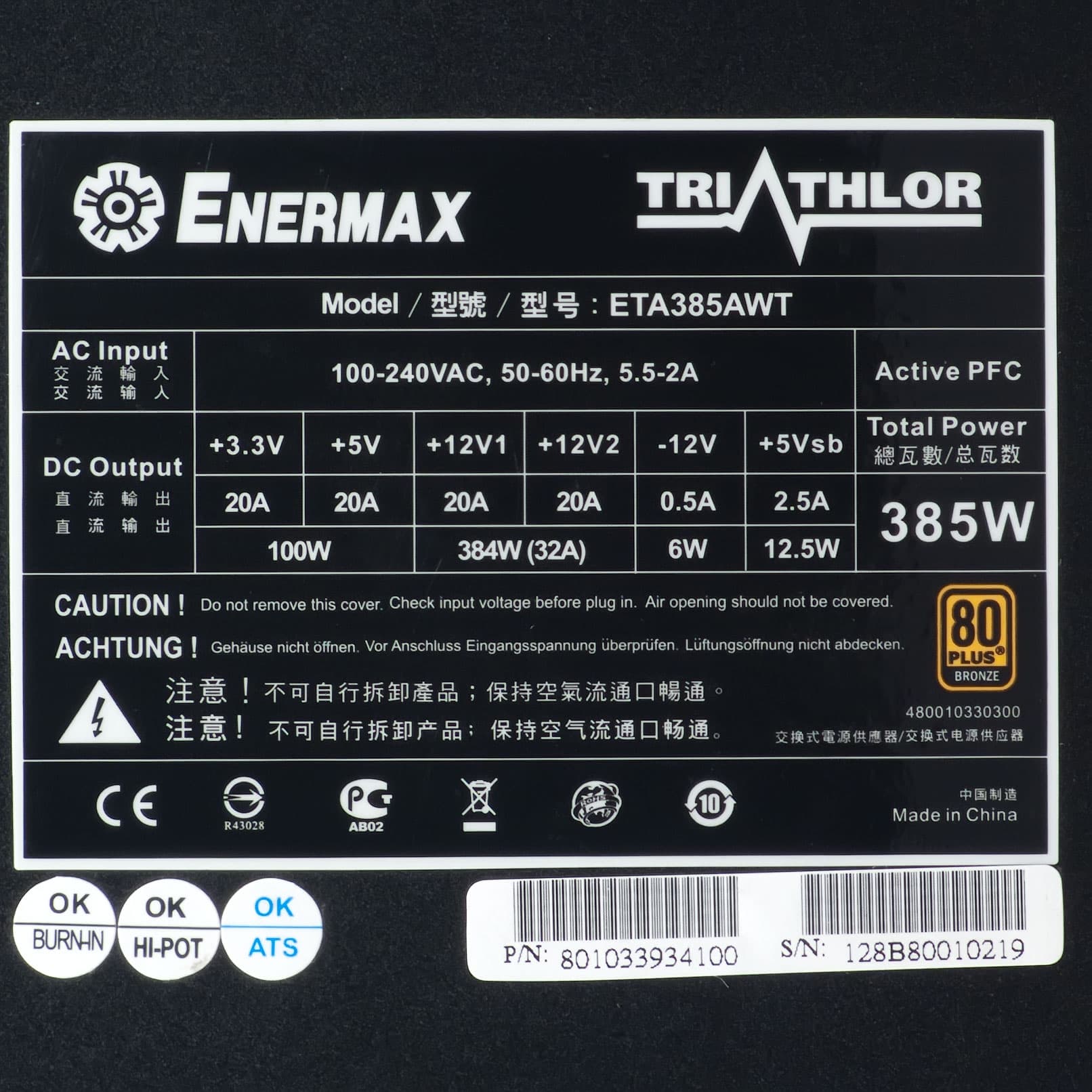 Все необходимые параметры указаны на корпусе блока питания в полном объеме, для мощности шины +12VDC заявлено значение 384 Вт (32 А). Соотношение мощности по шине +12VDC и полной мощности составляет 0,997 — это отличный показатель.