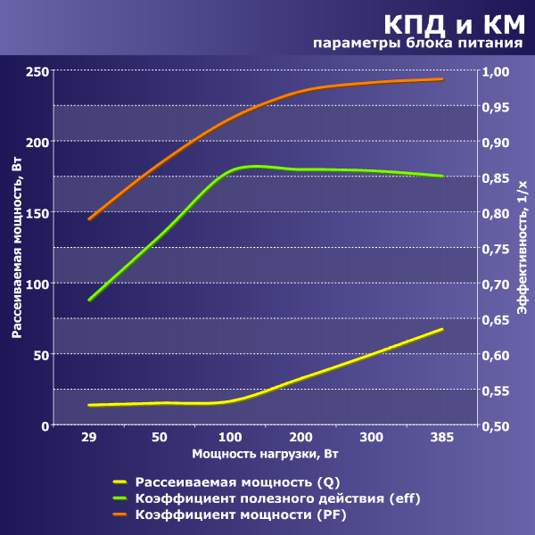 Согласно нашим измерениям, КПД данного БП достигает значения свыше 85% в диапазоне мощности от 100 до 385 ватт, максимальное зарегистрированное значение составило около 85,9% на мощности 200 Вт. Одновременно с этим, КПД на мощности 50 Вт составил около 76%, на мощности 27 Вт — около 67%. Это средний показатель для современных блоков питания.