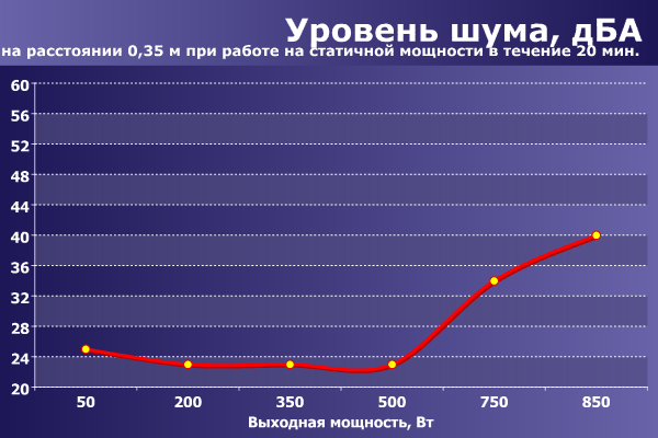 На максимальной мощности, при нагрузке в 850 Вт, шум блока питания преодолевает эргономичный уровень в 40 дБА при условии настольного размещения, то есть при расположении блока питания в ближнем поле по отношению к пользователю. Ничего страшного в этом нет, так как в реальности «раскочегарить» блок питания до такого уровня будет весьма непросто, особенно если принять хотя бы минимальные меры по организации нормальной вентиляции в корпусе системного блока.
