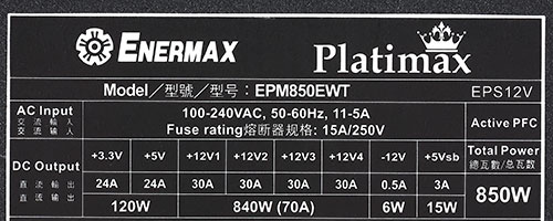Все необходимые параметры указаны на корпусе блока питания в полном объеме, для мощности шины +12VDC заявлено значение 840 Вт (70 А). Соотношение мощности по шине +12VDC и полной мощности составляет 0,988 — это отличный показатель для блоков питания подобной мощности.