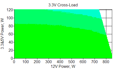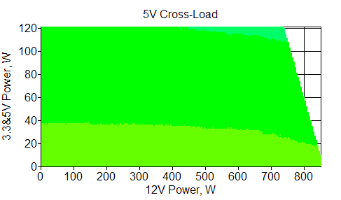 Следующим этапом инструментального тестирования является построение кросснагрузочной характеристики (КНХ) и представление ее на четвертьплоскости, ограниченной максимальной мощностью по шине 3,3&5 В с одной стороны (по оси ординат) и максимальной мощностью по шине 12 В с другой стороны — по оси абсцисс. В каждой точке измеренное значение напряжения обозначается цветовым маркером в зависимости от отклонения от номинального значения.