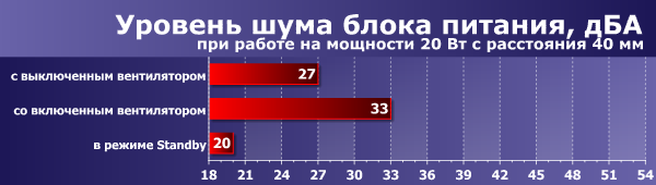 Шум блока питания находится на низком уровне в достаточно широком диапазоне мощности. Это значит, что уровень шума от работы БП будет незаметен на фоне типичного фонового шума в помещении в дневное время суток, особенно при условии эксплуатации данного блока питания в системах, не имеющих какой-либо звукошумовой оптимизации.