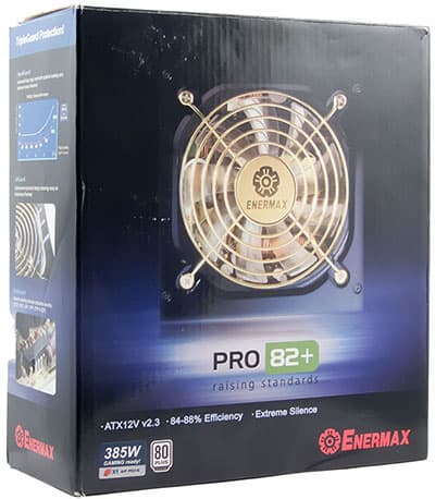 Сегодня мы познакомимся с серией PRO82+ от Enermax, которая располагается на полступени ниже серии MODU82+, ее будет представлять младшая, а значит, и самая доступная модель — EPR385AWT, имеющая максимальную выходную мощность 385 ватт. Помимо данной модели в серии PRO82+ представлены модели мощностью 425,525 и 625 ватт.