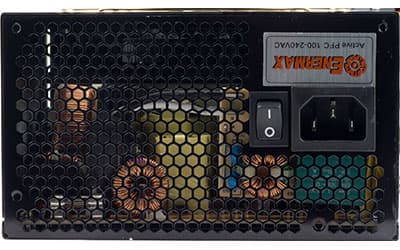 Никаких элементов постоянной подсветки в блоке питания нет. На внешней стороне корпуса БП расположен выключатель сетевого питания и разъем для подключения сетевого кабеля. С другой стороны корпуса размещено монтажное отверстие для вывода проводов, оснащенное защитной пластиковой прокладкой.