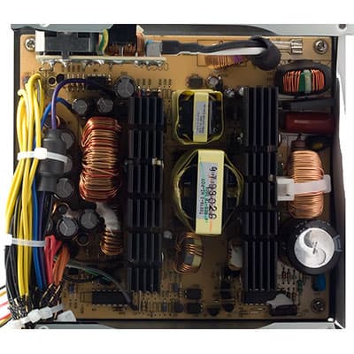 Основные полупроводниковые элементы установлены на небольшие радиаторы с основанием, толщиной около 4 мм. Конструкция радиаторов совмещает хорошую тепловую эффективность и малые габариты, чему способствует весьма приличная толщина основания радиаторов, а также поперечные пропилы в верхней части радиатора. Учитывая такую конструкцию, радиаторы практически не перекрывают расположенные рядом с ними элементы (трансформаторы, дроссели, конденсаторы), что должно положительно сказаться на динамике воздушного потока, и, как следствие, качестве охлаждения всех элементов внутри корпуса блока питания.