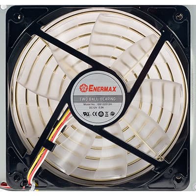 Под вентиляционным отверстием, закрытым проволочной решеткой, установлен нагнетающий вентилятор Enermax EB122512H с максимальным током потребления 0,3 А. Вентилятор основан на двойном шарикоподшипнике, что должно положительно сказаться на сроке его службы. Схема подключения вентилятора — четырехпроводная, что говорит об использовании встроенного в вентилятор ШИМ-контроллера.