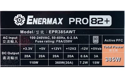 Enermax PRO82+ 385 (EPR385AWT) | 20 | 20 | 20 | 20 | — | — | 110 | 360 | 385 |