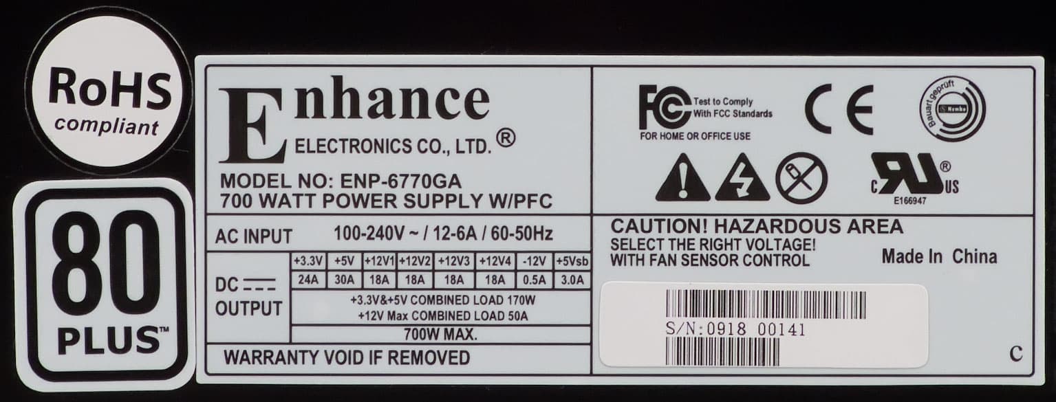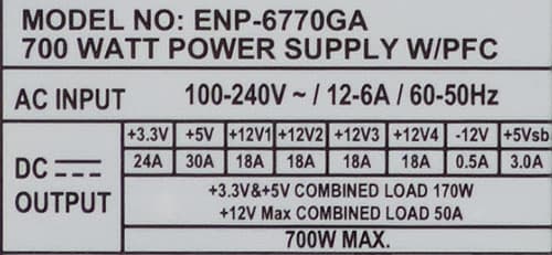 Все необходимые параметры указаны на корпусе блока питания в полном объеме. Мощность шины +12VDC заявлена в размере 600 Вт. Данная величина находится между соответствующими значения типовых блоков питания мощностью 600 и 650 Вт, соотношение мощности по шине +12VDC и полной мощности составляет 0,857, что также далеко от идеала. У многих современных моделей схожей мощности данное соотношение составляет 0,9 и более.