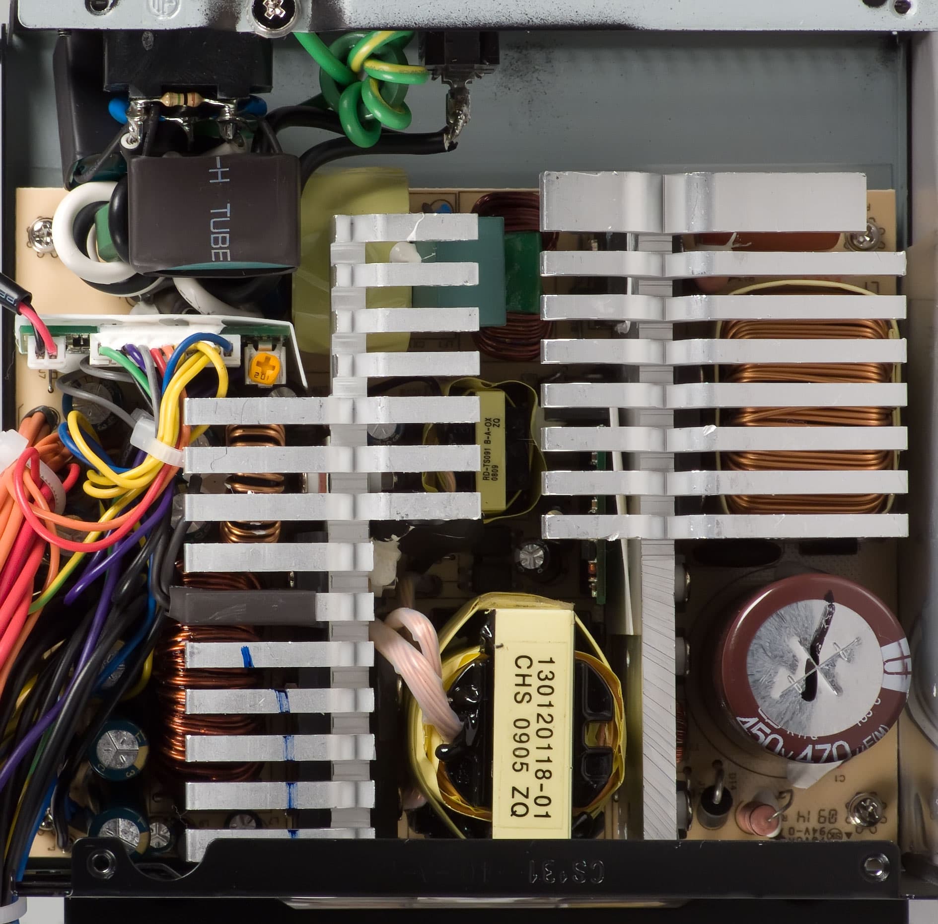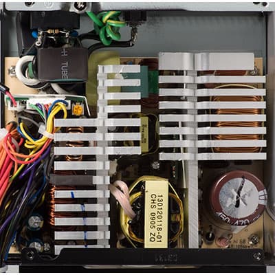 Основные полупроводниковые элементы, включая входные диодные сборки в количестве двух штук, установлены на двух массивных радиаторах, имеющие толщину основания около 5 мм. В верхней части радиаторы имеют достаточно развитое оребрение и частично перекрывают расположенные рядом с ними элементы. При этом, для обдува накопительного конденсатора входного выпрямителя и основного трансформатора оставлено достаточно места, а лепестки на радиаторах около вышеуказанных элементов отсутствуют. В целом, видимо, при разработке данной платформы уделялось большое внимание аэродинамике внутреннего объема блока питания, поэтому несмотря на довольно приличную заявленную мощность особой скученности элементов в большей части блока питания не наблюдается. Достаточно сильно заполнен лишь объем около выходного каскада, но по большей части в этом виновато большое количество проводов, предназначенных для подключения комплектующих и в этом ничего удивительного нет.