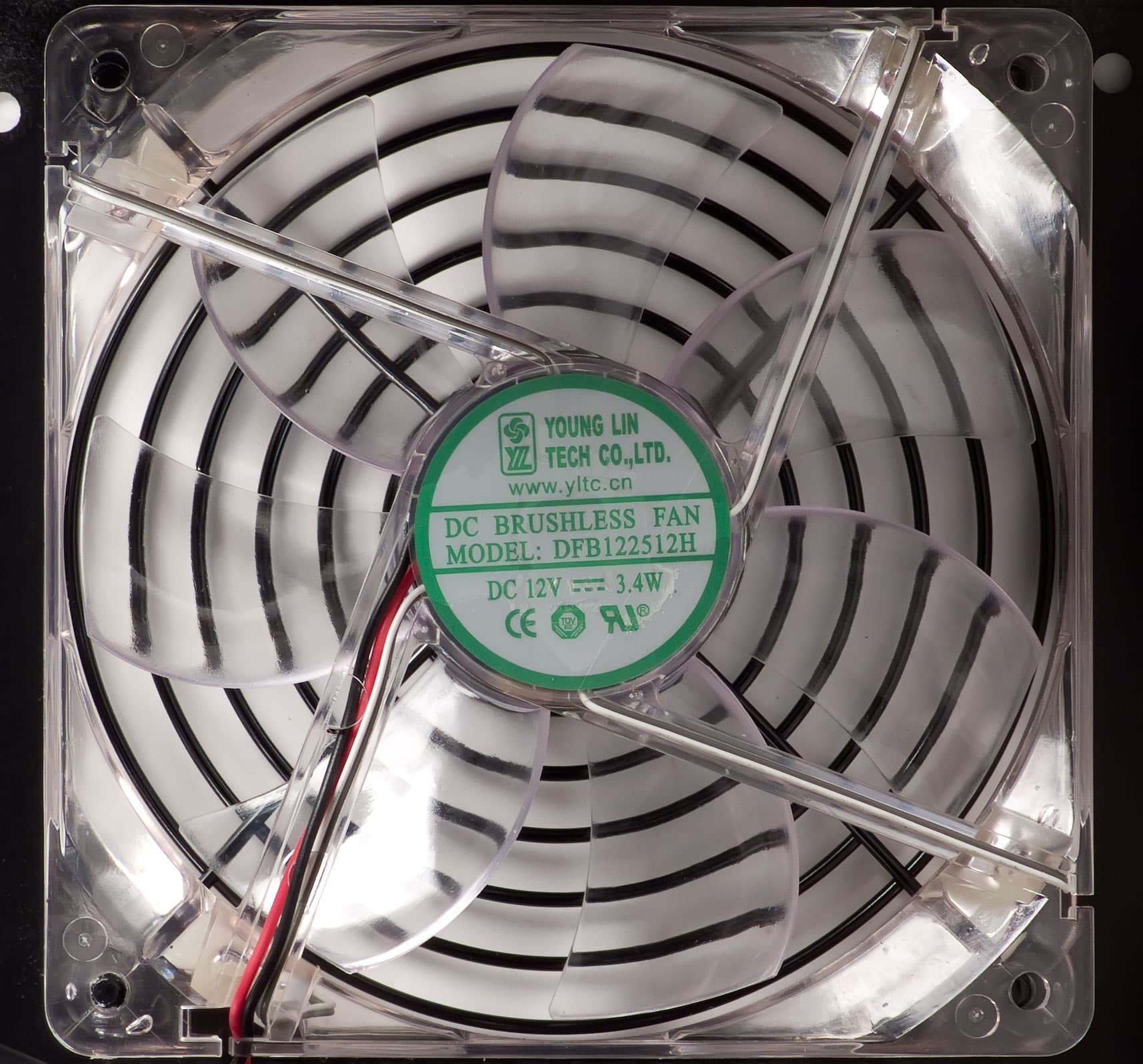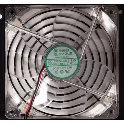 В блоке питания установлен вентилятор DFS122515H, произведенный компанией Young Lin Co LTD. Вентилятор имеет подсветку, реализованную при помощи светодиодов белого цвета. Реализацию подсветки можно признать удачной по двум причинам: выбран удачный цвет, яркость и направленность подсветки не достовляет дискомфорт в затемненном помещении при штатной установке в корпус.