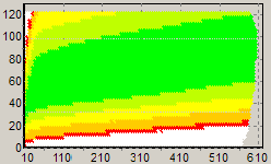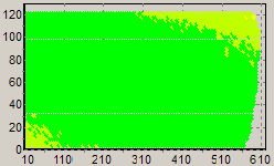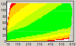 Первым этапом инструментального тестирования является построение кросснагрузочной характеристики (КНХ) и представление ее на полуплоскости ограниченной максимальной мощностью по шине 3,3&5V с одной стороны (по оси ординат) и максимальной мощностью по шине 12V с другой стороны – по оси абсцисс. В каждой точке измеренное значение напряжение обозначается цветовым маркером в зависимости от отклонения от номинального значения.
