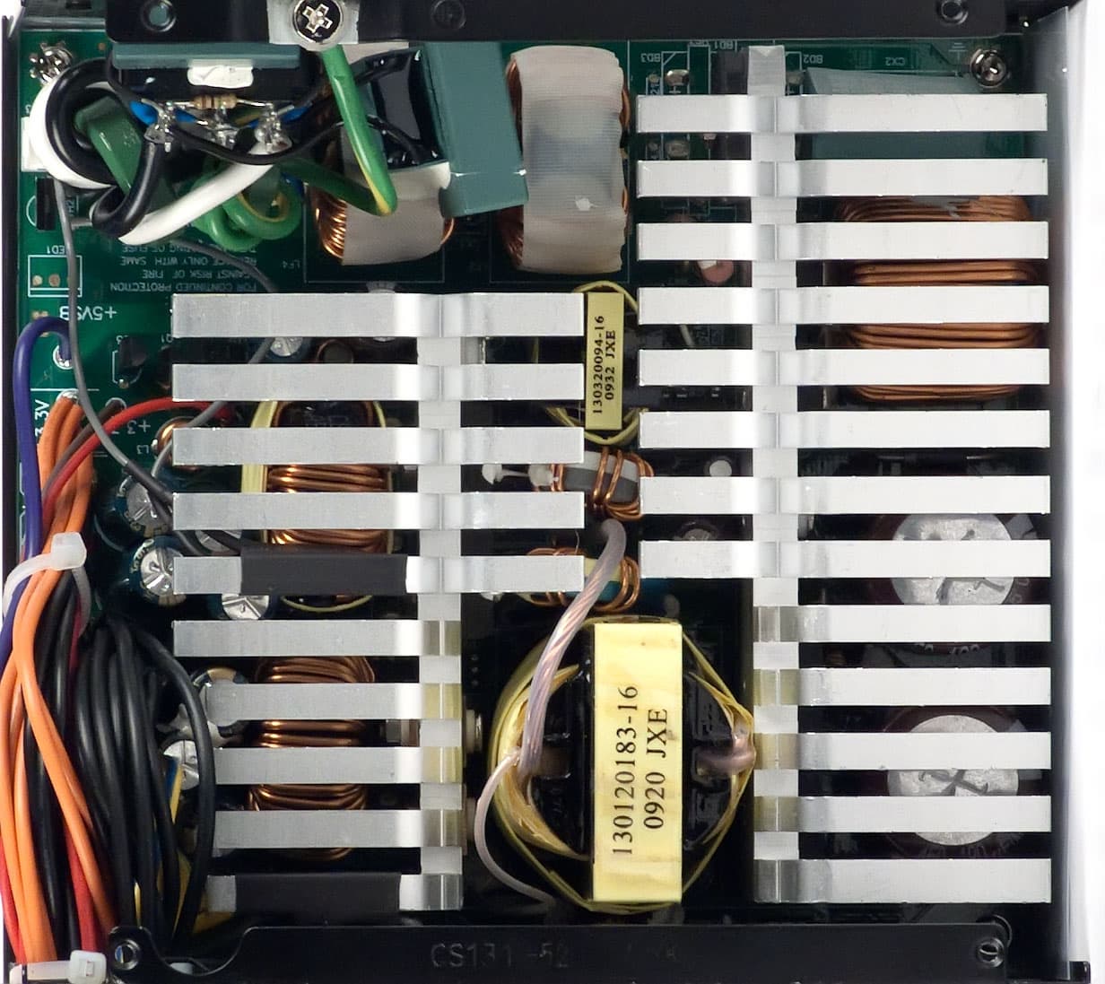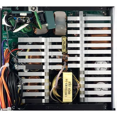 Во входном каскаде установлена батарея из двух конденсаторов серии SMQ производства компании Nippon Chemi-Con, каждый из которых имеет емкость 180 мкФ (450 В). В данном случае эквивалентная емкость батареи составляет около 360 мкФ. Конденсаторы подобной емкости обычно устанавливают в блоки питания мощностью 550—600 ватт, в моделях же мощностью 700 ватт обычно применяют батареи из двух конденсаторов эквивалентной емкостью порядка 500—600 мкФ. Так что определенная экономия тут налицо.