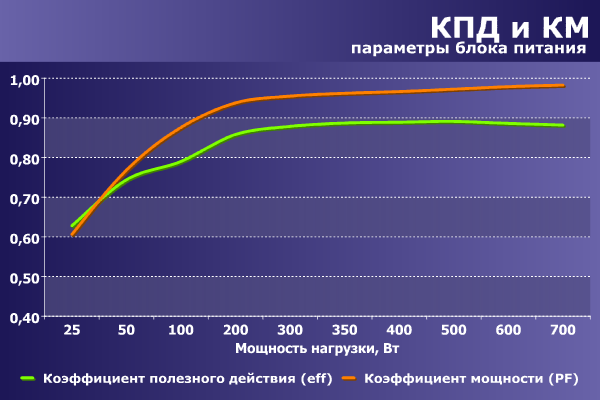 Очередной этап тестирования заключается в измерении полной мощности, подведенной к блоку питания, активной мощности, потребленной им, и расчете коэффициента полезного действия и коэффициента мощности.