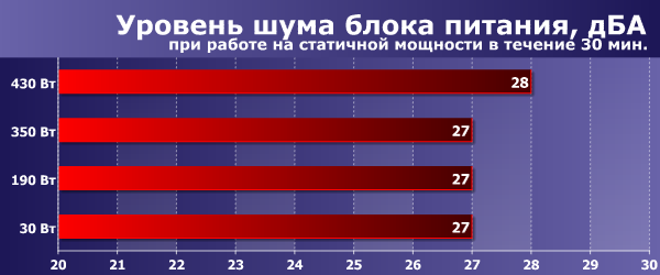 Электрические параметры блока питания находятся на очень хорошем уровне. Отклонения свыше пяти процентов отсутствуют во всем измеренном диапазоне мощности. Отклонения от номинала напряжений по линиям +12VDC и +5VDC не превышают одного процента, по линии +3,3VDC — не превышает трех процентов.