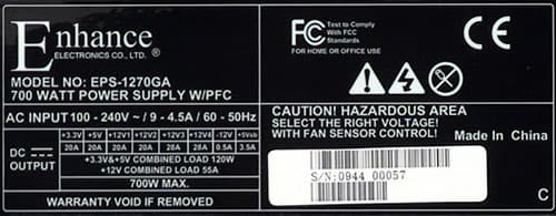 Все необходимые параметры указаны на корпусе блока питания в полном объеме. Для мощности шины +12VDC заявлено значение 660 Вт. Данная величина находится между соответствующими значениями типовых блоков питания мощностью 650 и 700 Вт, по факту недобрав до последнего 12 Вт. Соотношение мощности по шине +12VDC и полной мощности составляет 0,94, что является вполне удовлетворительным показателем для современных решений подобной мощности, правда модели лидеров рынка обычно имеют данный коэффициент на уровне 0,96—0,99.
