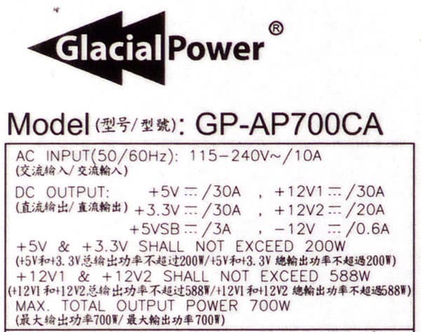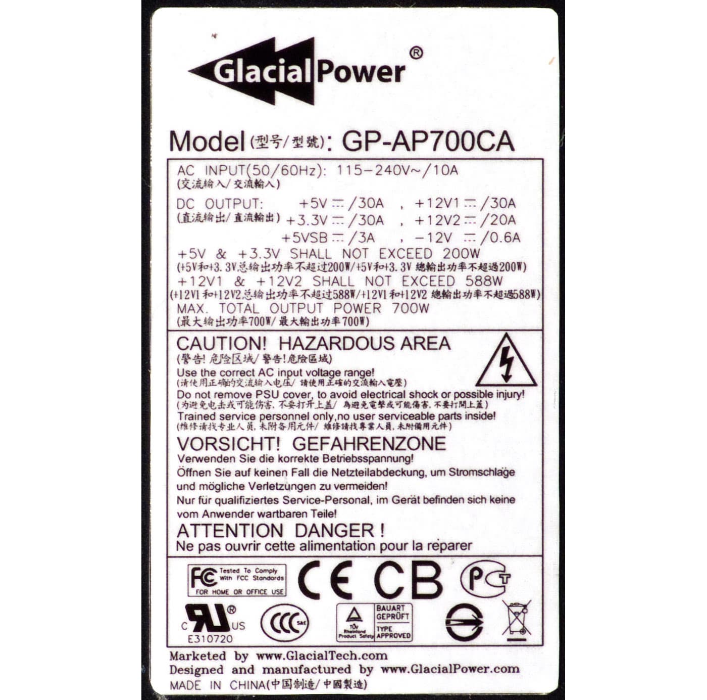 В данный момент нас интересует, разумеется, продукция компании GlacialPower, а именно производимые ей компьютерные блоки питания. В настоящее время в ассортименте компании присутствует пять серий блоков питания формата ATX: PS, SL, AL, AX, AP. Предоставленный нам на тестирование блок питания GP-AP700CA является старшей моделью в серии AP, где помимо него присутствуют также модели мощностью 500 и 600 ватт.