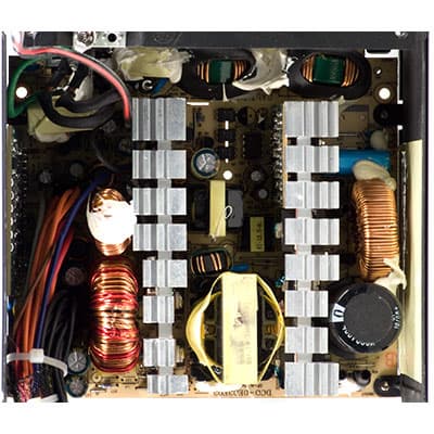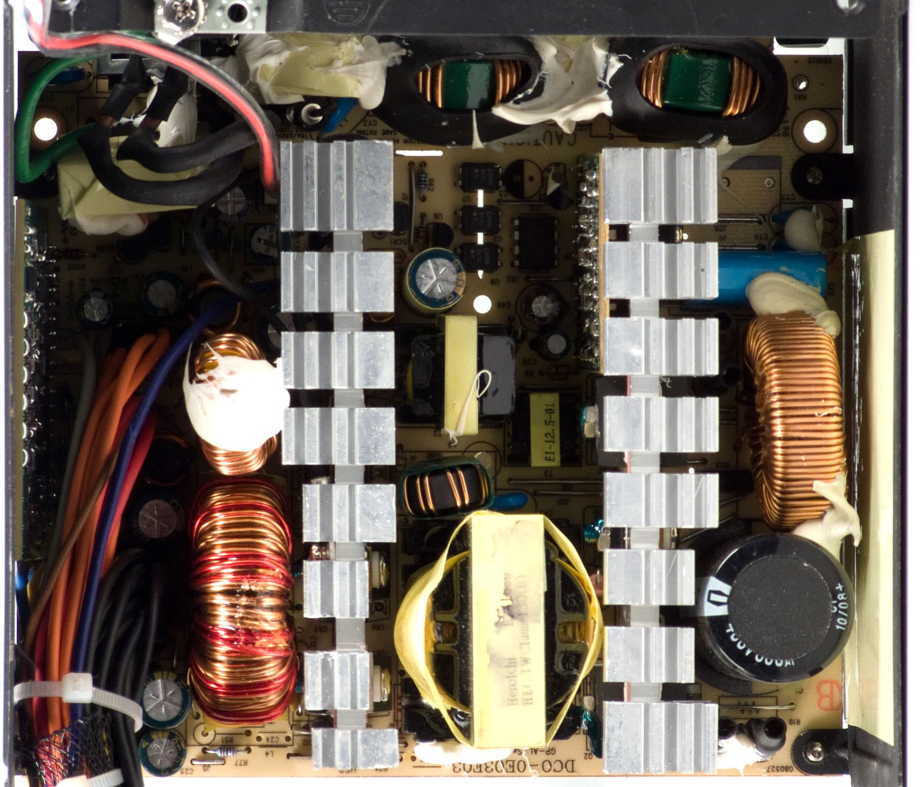 Основные полупроводниковые элементы установлены на довольно компактные радиаторы с основанием толщиной около 5 мм. Конструкция радиаторов совмещает хорошую тепловую эффективность и малые габариты, чему способствует весьма приличная толщина основания радиаторов, а также поперечные пропилы в верхней части радиатора. Радиаторы минимально перекрывают расположенные рядом с ними элементы (трансформаторы, дроссели, конденсаторы), что должно положительно сказаться на динамике воздушного потока, и, как следствие, на качестве охлаждения всех элементов внутри корпуса блока питания. Коэффициент заполнения внутреннего объема блока питания используемыми компонентами находится на среднем уровне, за исключением участка выходного каскада, где он довольно высок, хотя это вполне типично.