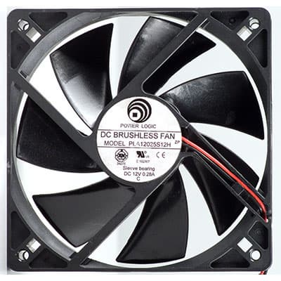 Под проволочной решеткой установлен нагнетающий вентилятор Power Logic PLA1225S12H. Вентилятор основан на подшипнике скольжения. Применение вентилятора на подшипнике скольжения в столь термонагруженном узле, каким является блок питания, тем более весьма мощный, нельзя признать оптимальным решением. Подключение вентилятора двухпроводное через двухконтактный разъем.