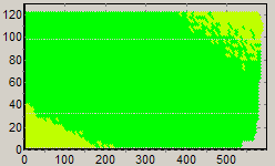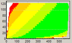 Первым этапом инструментального тестирования является построение кросснагрузочной характеристики (КНХ) и представление ее на полуплоскости ограниченной максимальной мощностью по шине 3,3&5V с одной стороны (по оси ординат) и максимальной мощностью по шине 12V с другой стороны — по оси абсцисс. В каждой точке измеренное значение напряжение обозначается цветовым маркером в зависимости от отклонения от номинального значения.