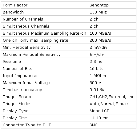 Для измерения пульсаций выходных напряжений будет использоваться 2-х канальный цифровой осицилограф DS-1150 производства EZ Digital, имеющий полосу пропускания 150 МГц.
