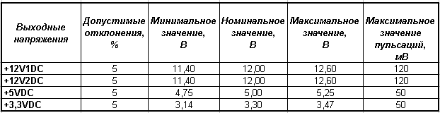 Допустимые значения пульсаций и значений выходных напряжений, а также основные требования к блокам питания, приведены в Power Supply Design Guide, последняя версия которого — 2.2.
