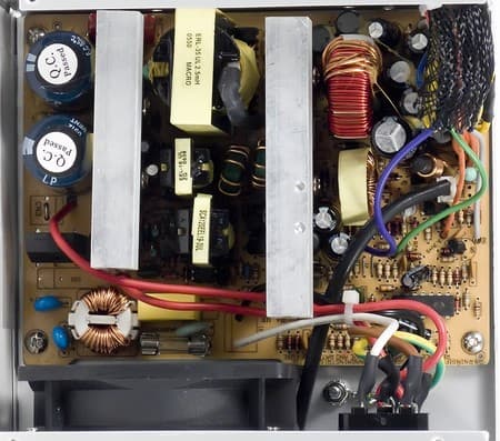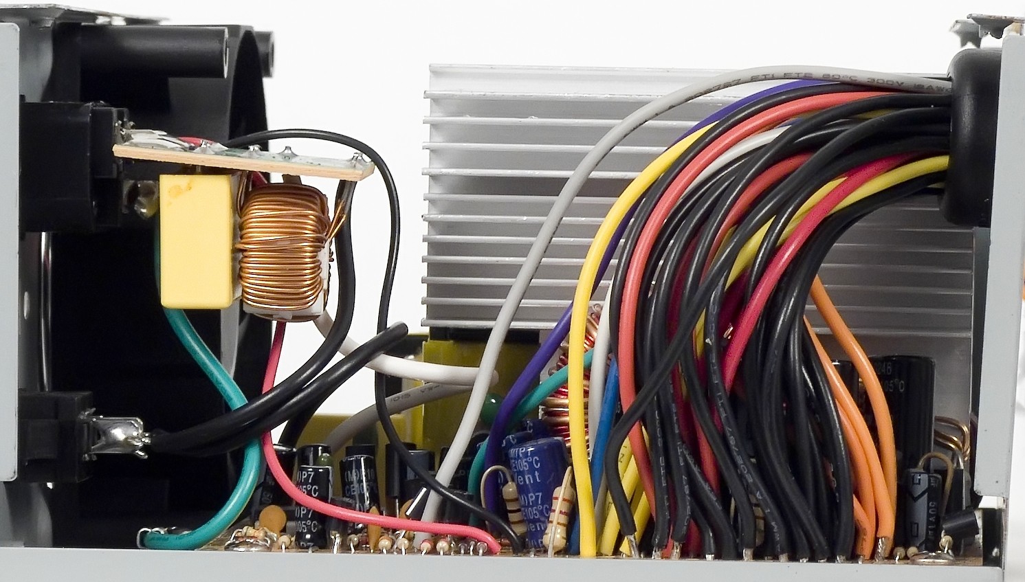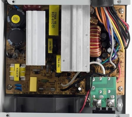 Внутренне блок питания большей частью копирует MGE500WP. Различия видны лишь при более детальном рассмотрении. В данном БП нет переключателя входного напряжения, однако он по-прежнему не является FullRange-устройством.