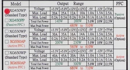 При сравнении последней с аналогичным параметром типовых БП из Power Supply Design Guide for Desktop Platform, данный блок питания располагается практически на уровне типового БП мощностью 270 Вт, "проиграв" последнему 4 Вт. Что ставит XG450WP даже немного выше более дорогого MGE500WP, рассмотренного нами ранее.