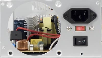 Внутри все элементы блока питания размещены на одной плате. Монтаж не очень плотный, поэтому проблем с охлаждением из-за затруднения прохода воздушных потоков быть не должно. Какая-либо схема коррекция мощности (PFC) в MGE500WP не применяется. Данный БП не относится к устройствам FullRange, он оснащен переключателем входного напряжения 115/230В и сменным предохранителем.