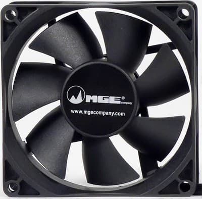 В блоке питания установлен 80 мм вентилятор MGE Сompany. К сожалению, каких-либо дополнительных характеристик производитель на нем указать не пожелал. Вентилятор подключен к плате стандартным двухпиновым коннектором, что облегчает его замену, если в таковой возникнет необходимость.