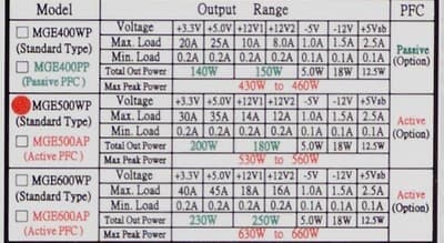 Становится понятно, что 500Вт в данном случае — это максимальная пиковая мощность, которую блок питания должен обеспечить в течение 17 секунд, и при этом не выйти из строя. Максимальная мощность у MGE500WP гораздо скромнее, она составляет всего 400Вт, из которых на шину 12V отводится лишь 180Вт. Если сравнить мощность последней с типовыми БП из Power Supply Design Guide for Desktop Platform, то станет видно, что MGE500WP находится на уровне между 220Вт и 270Вт блоками питания.
