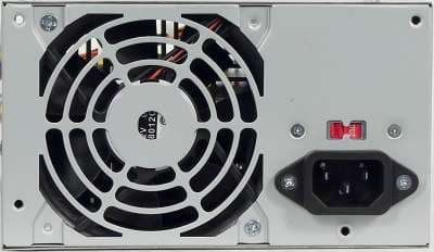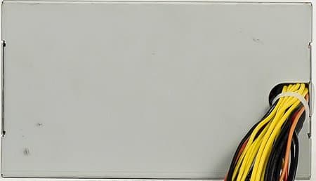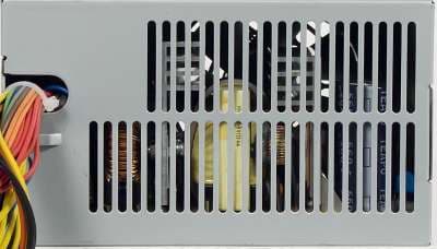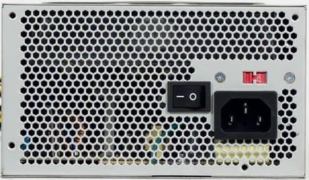 Блок питания собран в привычном стальном корпусе. Система его охлаждения выполнена с применением 120 мм вентилятора, смонтированного на нижней стенке БП. Задняя стенка блока питания обильно перфорирована, передняя же не содержит вообще никаких отверстий.