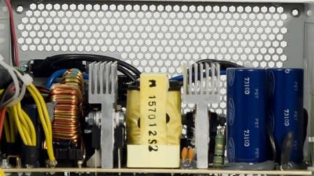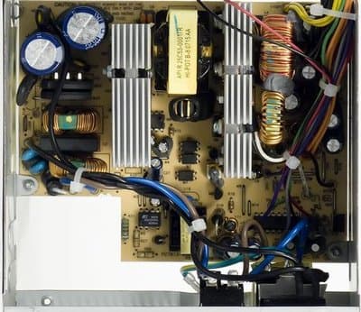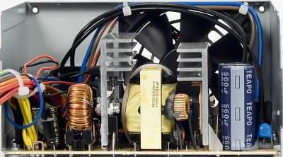 Во входном выпрямителе установлены конденсаторы производства Teapo емкостью 560мкФ (200 В). Модуль корректора коэффициента мощности отсутствует, переключение диапазонов питающего напряжения производится вручную.