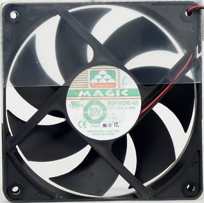 В блоке питания установлен вентилятор Protechnic Electric MGA12012MS-A25 с номинальным током потребления 0.38A. Вентилятор подключается к плате БП методом пайки, что несколько затруднит его замену, если в этом возникнет необходимость.