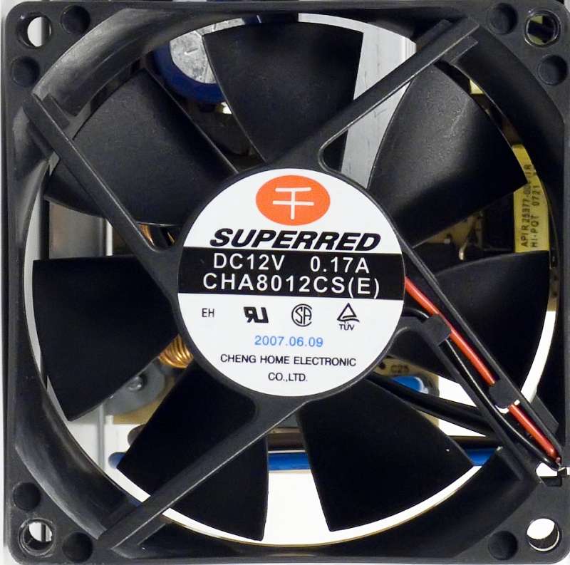 Корпус блока питания выполнен из стали, с одной стороны установлен вытяжной вентилятор Superred CHA8012CS(E) производства Cheng Home Electronic Company, с другой стороны корпуса размешено воздухозаборное вентиляционное отверстие, при этом других вентиляционных отверстий на корпусе БП нет, что должно положительно сказаться на аэродинамике воздушного потока, идущего через БП.