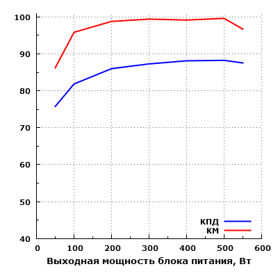 Эффективность БП находится на вполне достойном уровне. Согласно нашим измерениям, КПД данного БП достигает значения свыше 87% в диапазоне мощности от 300 до 550 ватт, максимальное зарегистрированное значение составило около 88,2% на мощности 500 Вт. Одновременно с этим, КПД на мощности 50 Вт составил около 75,8%.