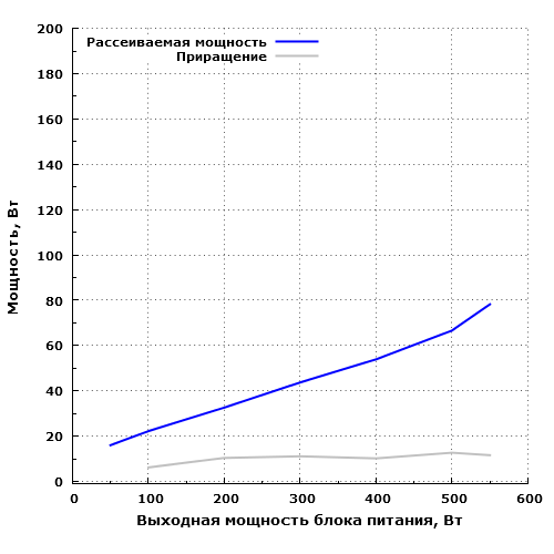 На максимальной мощности блок питания рассеивает около 78 Вт, а 60 Вт он рассеивает на мощности порядка 450 Вт. Это не рекордные, но вполне достойные показатели.