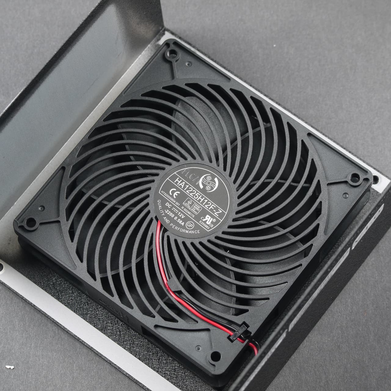 В блоке питания установлен вентилятор HA1225H12F-Z, который, судя по маркировке производителя, основан на гидродинамическом подшипнике и имеет скорость вращения 2200 об/мин. Вентилятор произведен компанией Dongguan Honghua Electronic Technology.