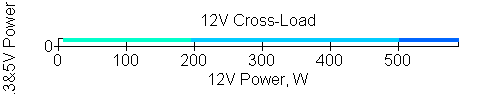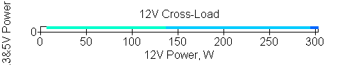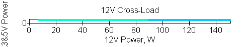 Следующим этапом инструментального тестирования является построение кросснагрузочной характеристики (КНХ) и представление ее на четвертьплоскости, ограниченной максимальной мощностью по шине 3,3&5 В с одной стороны (по оси ординат) и максимальной мощностью по шине 12 В с другой стороны — по оси абсцисс. В каждой точке измеренное значение напряжения обозначается цветовым маркером в зависимости от отклонения от номинального значения.