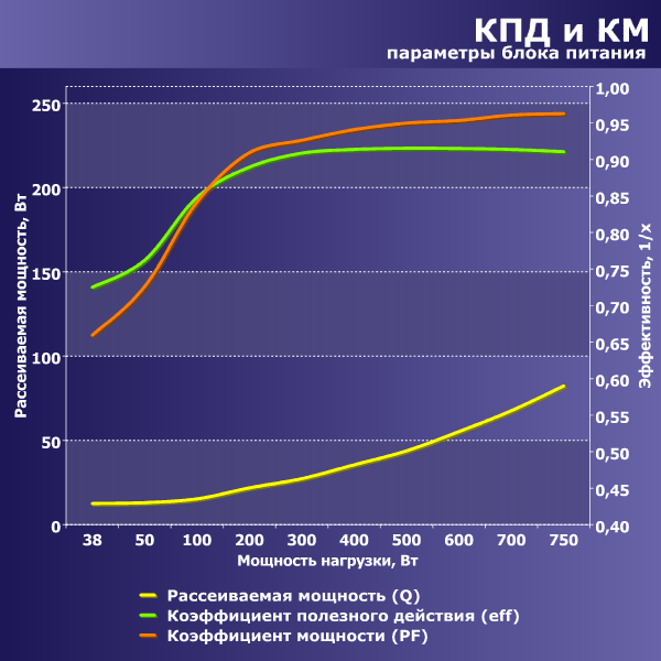 Согласно нашим измерениям, КПД данного БП достигает значения свыше 90 процентов в диапазоне мощности от 300 до 750 ватт включительно. Одновременно с этим, КПД на мощности 50 Вт составил около 76 процентов, на мощности 35 Вт — около 72 процентов. Это хороший показатель для современных блоков питания подобной мощности.