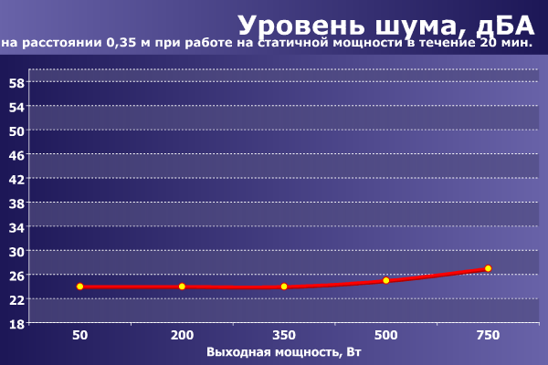Уровень шума данной модели можно считать очень низким до мощности 500 Вт включительно — разумеется, это достижимо при условии достаточного охлаждения БП.