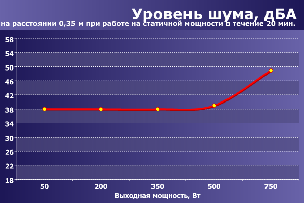 При работе на мощности до 500 Вт включительно шум находится на уровне выше среднего при расположении в ближнем поле; при более значительном удалении и размещении под столом в корпусе с нижним расположением БП такой шум можно будет трактовать как находящийся на среднем уровне. В дневное время суток в жилом помещении источник с подобным уровнем шума будет хорошо заметен, но достаточно легко переносим, особенно на расстоянии метра и более, а в офисном помещении он будет не слишком заметен, так как фоновый шум в офисах обычно выше, чем в жилых помещениях. В ночное время суток источник с таким уровнем шума будет хорошо заметен, спать рядом будет затруднительно.
