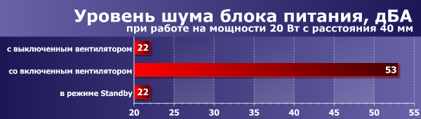 При подготовке данного материала мы продолжили использовать новую методику измерения уровня шума блоков питания, которая пока имеет статус экспериментальной. Блок питания располагается на ровной поверхности вентилятором вверх, над ним на расстоянии 0,35 метра размещается измерительный микрофон шумомера Октава 110А-Эко, которым и производится измерение уровня шума. Нагрузка блока питания осуществляется при помощи специального стенда, имеющего бесшумный режим работы. В ходе измерения уровня шума осуществляется эксплуатация блока питания на постоянной мощности в течение 20 минут, после чего производится замер уровня шума.