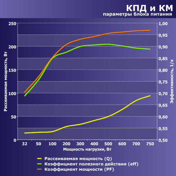 Согласно нашим измерениям, КПД данного БП достигает значения свыше 90 процентов в диапазоне мощности от 300 до 600 ватт, максимальное зарегистрированное значение составило около 91 процента на мощности 500 Вт. Одновременно с этим, КПД на мощности 50 Вт составил около 75 процентов, на мощности 32 Вт — около 69 процентов. Показатели для современных блоков питания подобной мощности и стоимости вполне типичные.