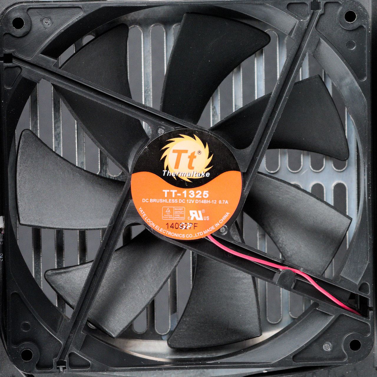 Вентилятор, установленный в блоке питания, брендирован компанией Thermaltake, однако на нем имеется и маркировка завода-изготовителя. В данном случае перед нами продукт производства компании Yate Loon Electronics — D14BH-12 типоразмера 140 мм (125 мм между центрами крепежных отверстий), имеющий, по данным производителя, максимальную скорость вращения 2800 оборотов в минуту. Вентилятор основан на подшипнике качения, что должно положительно сказаться на сроке его службы.